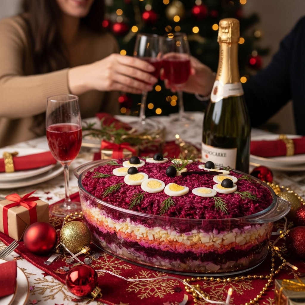 Заданием четвёртого дня было описать Новогоднее блюдо. Бордово-желто-оранжевая феерия! Но как же её не попробовать? Казалось бы, ничего особенного: вареные картошка, морковка, свёкла, да ещё солёная рыба. Всё это уложено слоями и пропитано майонезом. Но какой изысканный вкус! Только в русской кухне есть такое блюдо «Селёдка под шубой»! Иностранцам долго приходиться объяснять, что название – это аллегория. Ведь нет ничего такого в кушанье, что напоминало бы собой мех. И селёдке нужно меховое пальто также как и зонтик. Зато можно включить фантазию и наслаждаться салатом. А если «Селёдку под шубой» украсить цветами из солёного огурца или моркови, разложить по периметру кусочки варёного яйца и написать сверху майонезом дату Нового Года – получится просто шедевр!