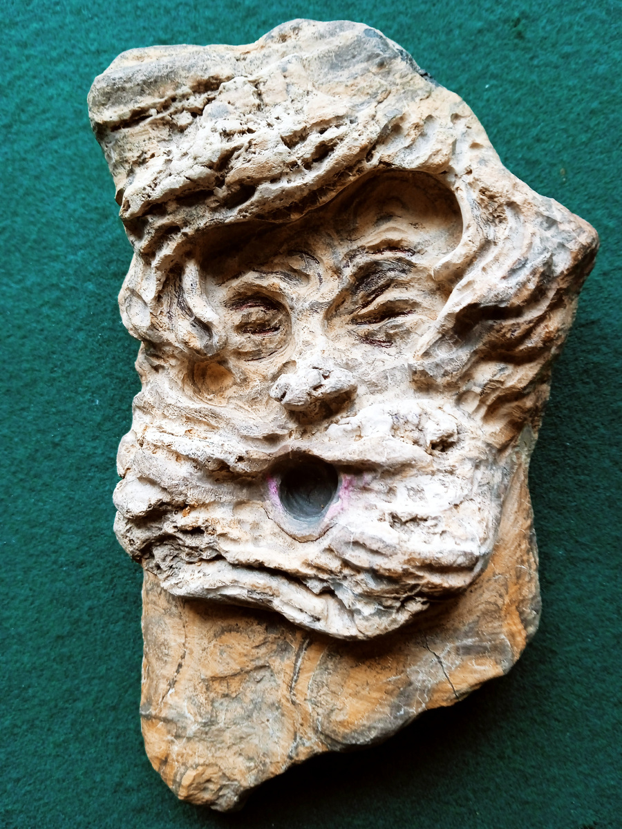 Но вернемся к работе. Разметавшиеся волосы персонажа были столь хороши, что я боялся лишний раз к ним притронуться. Интересно, что борода обрывалась на находке сама по себе и обнажала крепкую загорелую шею (вот где пригодился коричневый цвет камешка). Я не стал её дорабатывать и выделять столь характерный для мужской шеи кадык. Я просто слегка обточил её и она стала крепкая и прямая, как столб. Это только подчеркивало несокрушимость образа. Лицо я, конечно, проработал, но очень грубо (персонаж - то народный,а не изнеженный Евгений Онегин). Фрезой я изготовил кричащий рот. Тут природа немного поскупилась: впередсмотрящий должен был кричать более темпераментно. Если с чем-то сравнивать, то не менее темпераментно, чем кричал свой знаменитый монолог: “Дуй ветер…” шекспировский король Лир. Но место для столь яростного крика у природной находки не хватило, и, как говорил известный украинский политический деятель: “Маэмо що маэмо”. (Имеем то, что имеем).
