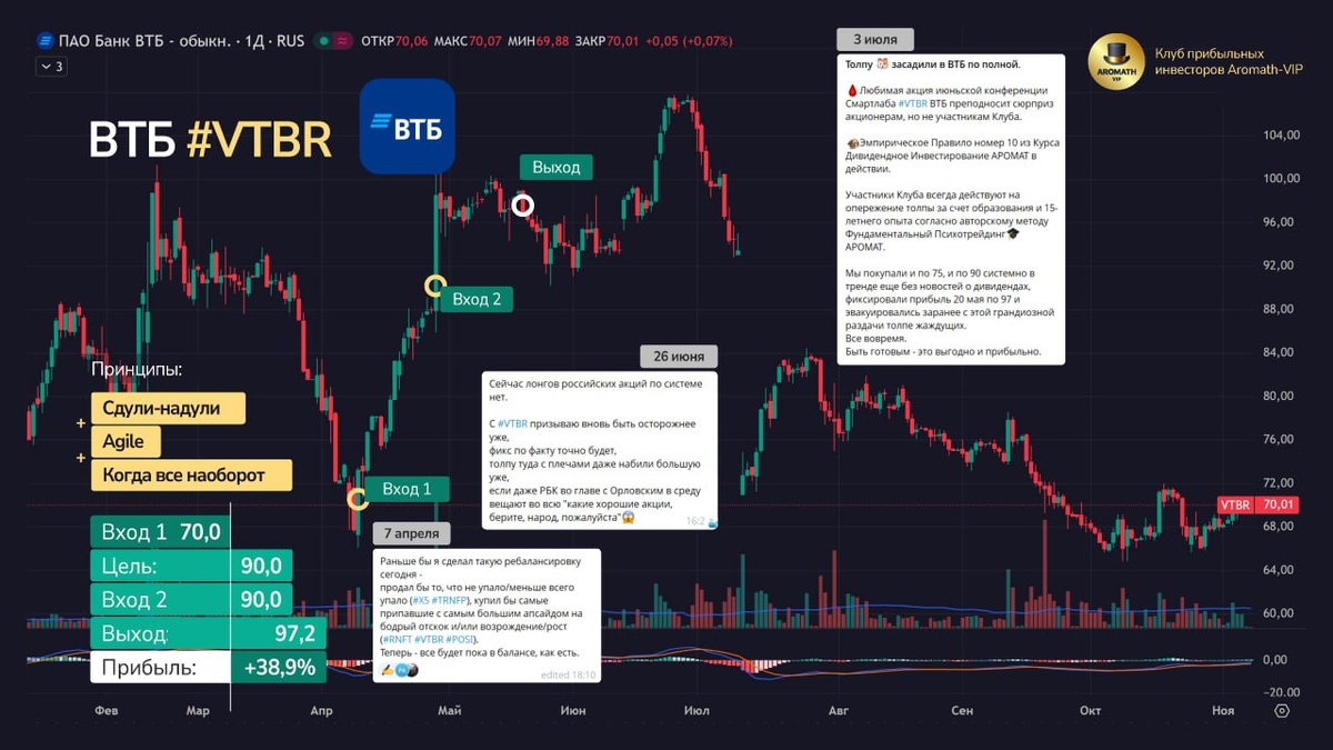 Весна 2025 года. Рынок трясёт, в апреле идут маржин-колы, принудительные продажи, инвесторы напуганы и закрывают позиции. Это лучшее время для поиска новых возможностей. 👉 Вход: когда другим страшно. Первый заход в ВТБ - начало апреля, район 70 рублей за акцию. На тот момент рынок ещё под давлением, но по графику ВТБ видно: продавливание идёт на фоне паники, а не потому, что сам актив умер. Дальше происходит важное: тренд разворачивается вверх и идёт быстро. Цена перестаёт падать, появляется уверенный рост. Движение идёт в нашу сторону. 👉 Второй этап - пирамидинг по тренду. Когда рост закрепляется, добавляем позицию по 90 рублей, поднимаем среднюю, но одновременно наращиваем общую потенциальную прибыль. Всё строго по рабочей таблице-светофор Клуба, без эмоций: тренд есть - позицию усиливаем. Такая тактика пирамидинга по тренду позволяет максимально взять движение, когда рынок едет туда, куда нам нужно. Мы уже сидим "в правильном вагоне поезда за прибылью". 👉 Дивиденды и эйфори