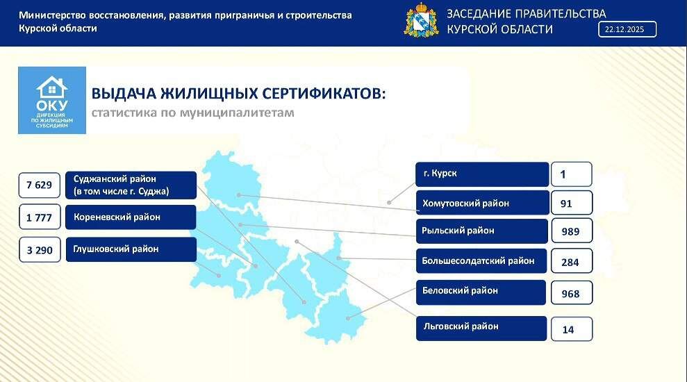 Курянам выдано 15 039 сертификатов на сумму 93,2 млрд рублей с 2023 года. При этом, по словам заместителя губернатора Елены Атановой, рассмотрено более 17 тысяч заявлений. Реализовано уже 10 тысяч сертификатов. В настоящее время власти готовят новый перечень на 695 сертификатов. Кроме того, Атанова продемонстрировала слайд со статистикой количества сертификатов, выданных по районам Курской области.