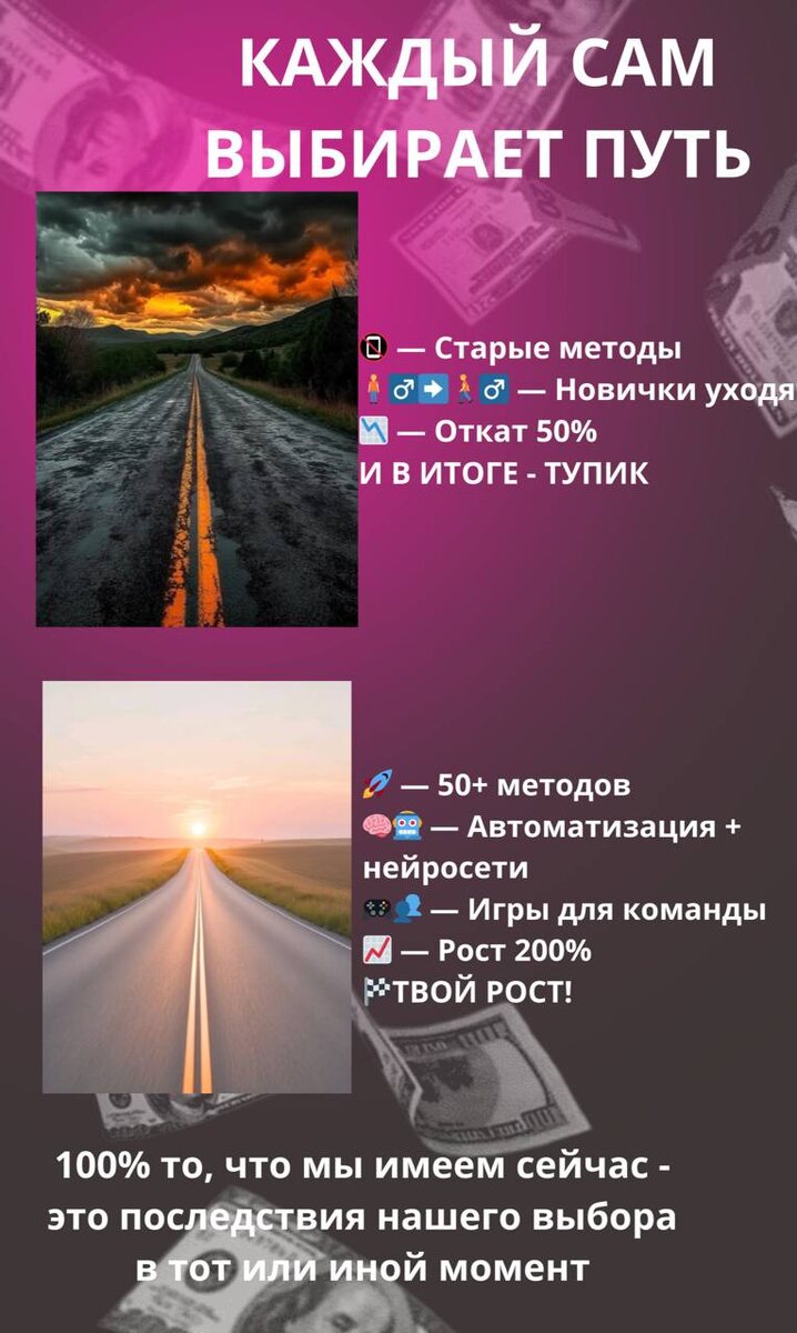 Какой выберешь? Посмотри на эту картинку внимательно. Это не абстракция. Это твоё возможное будущее в 2026 году. 👉Первый путь — это путь наименьшего сопротивления. Делать то, что уже не работает. Думать, что «и так сойдёт». Надеяться на авось. 😞Итог предсказуем: выгорание, откат, разочарование. Ты будешь работать ещё больше, а получать — ещё меньше. 👉Второй путь — это путь осознанного выбора. 💅Выбрать систему вместо хаоса. 💅Инвестировать в инструменты вместо того, чтобы терять время. 💅Взять готовые методы, которые уже дают рост сотням. ✈️Итог: ты становишься архитектором своего бизнеса, а не его заложником. 💯Выбор кажется очевидным? Но 90% сетевиков подсознательно идут по первому пути. Потому что он привычный. Потому что не нужно ничего менять. Потому что страшно. Мы убрали «страшно». Мы дали второй путь в виде готового комплекта: PRO-Рекрутинг + Секретный чат. Тебе не нужно искать методы, придумывать систему, изобретать игры. Всё уже собрано, упаковано и проверено. Остал