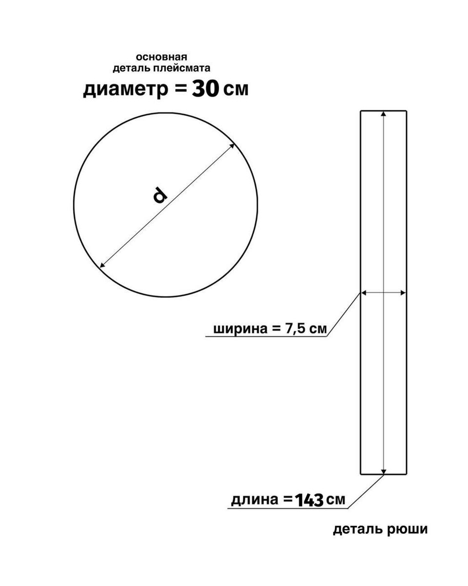 ⬆️ Припуски уже включены. Диаметр основной детали - 30 см. Если под рукой нет циркуля, можно обвести большую тарелку, крышку или поднос. Длина рюши - 143 см, ширина - 7,5 см. Диаметр основной детали может быть любым. Для того, чтобы рассчитать размеры рюши, используйте формулу: Lрюши = 1,5 х 3,14 х d + 2 Где: Lрюши - длина рюши; 1,5 - это кофэффициент на сборку рюши, чем он больше, тем обьёмнее будет рюша, рекомендуем от 1,5 до 2; 3,14 - число пи; d - диаметр окружности; 2 - 2 см на припуски.