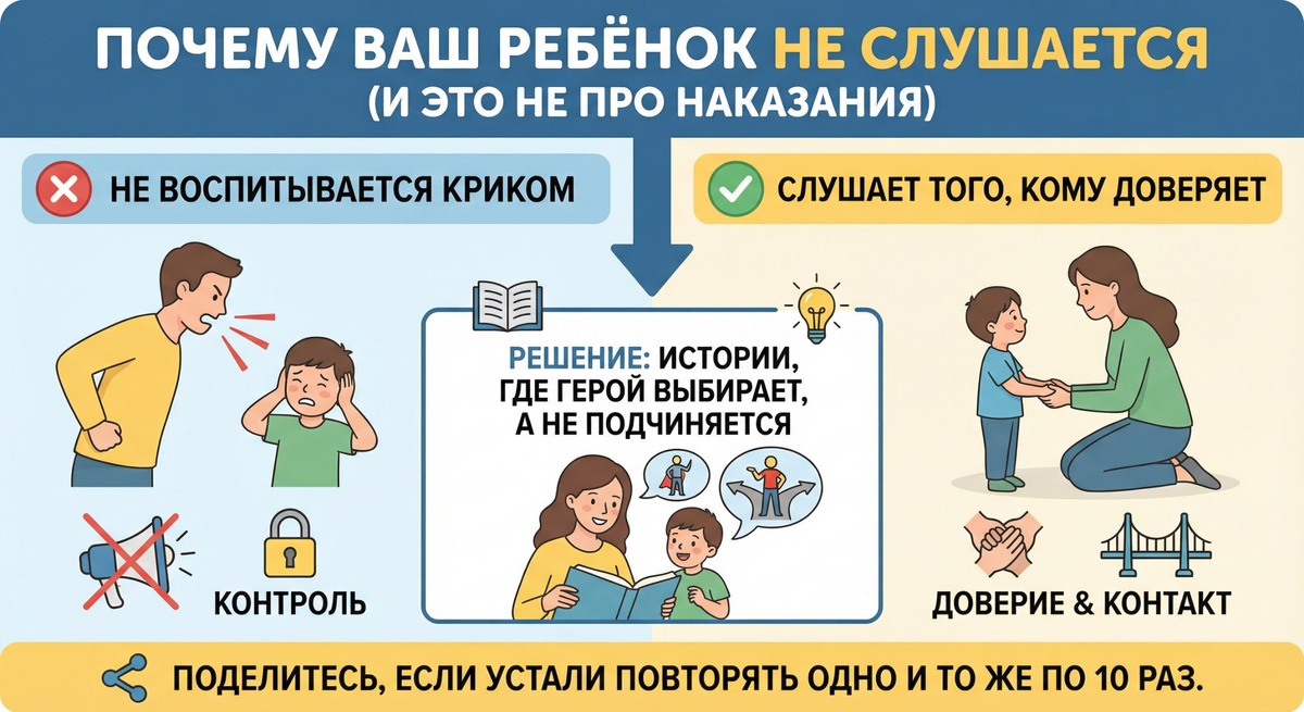 )” Послушание не воспитывается криком. Ребёнок слушает того, кому доверяет. Доверие строится через контакт, а не контроль. Решение: Истории, где герой выбирает, а не подчиняется. Поделитесь, если устали повторять одно и то же по 10 раз.