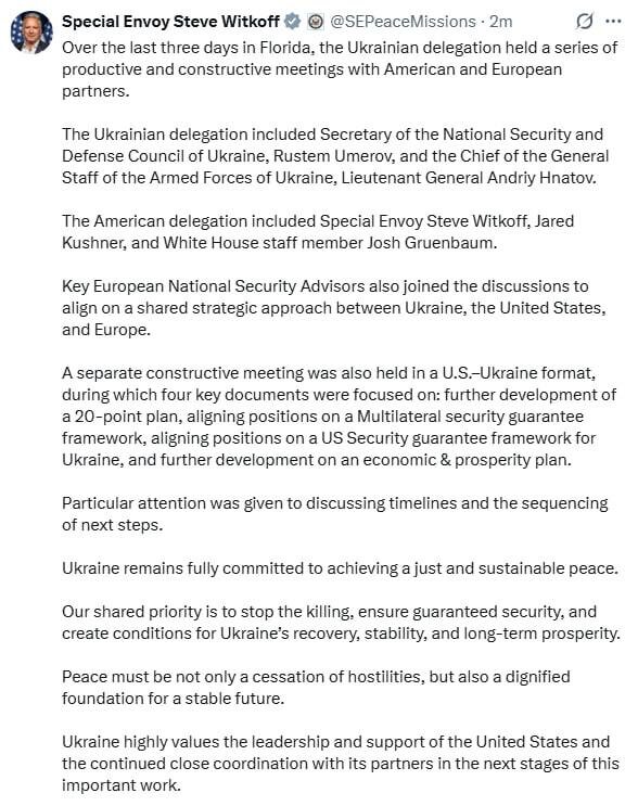 Спецпосланник Трампа сообщил, что в Майами внимание сторон было сосредоточено на четырех ключевых документах: Разработка 20-пунктного плана, согласование позиций в рамках многосторонних гарантий безопасности, а также гарантий США для Украины и дальнейшая разработка плана экономического развития и процветания. По словам Уиткоффа, «Украина остается полностью приверженной достижению справедливого и устойчивого мира».