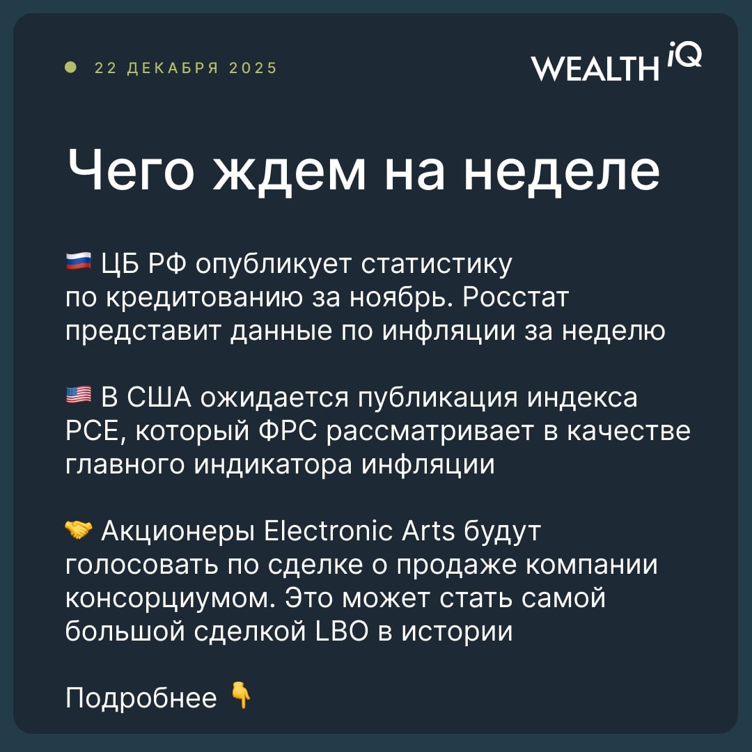 🇷🇺Россия: данные по ВВП и кредитованию На неделе Банк России опубликует статистику по кредитованию за ноябрь. Росстат в среду представит данные по инфляции за неделю с окончанием 22 декабря, а также по промышленному производству за прошлый месяц. Кроме того, в пятницу будет опубликован доклад о социально-экономическом положении, из которого мы узнаем ноябрьскую динамику ВВП. 🇺🇸США: инфляция и сделка по покупке Electronic Arts Во вторник в США ожидается публикация индекса PCE, который ФРС рассматривает в качестве главного индикатора инфляции. Также выйдут расширенные данные по ВВП за третий квартал. Акционеры Electronic Arts будут голосовать по сделке о продаже компании консорциумом, во главе которого — Суверенный фонд Саудовской Аравии, что может стать самой большой сделкой LBO в истории. #НеделяНачинается 🎅 @wealth_iqs