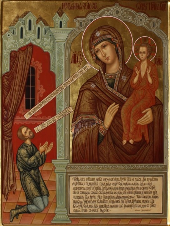 «Нечаянная Радость» «Знаете икону Пресвятой Богородицы, что называется «Нечаянная Радость»? Она показывает, как Пресвятая Богородица помогла одному грешнику одолеть страсть, им обладавшую. Хотя грешник был человек сей, но имел добрый обычай всякий день со слезами поклоняться Владычице пред святою иконою Ее во храме, мимо коего надлежало ходить ему. В одно утро заходит по обычаю грешник сей и поклоняется. Но, восклонив главу, видит, что у Предвечного Младенца на иконе Пресвятой Богородицы рубашка изодрана и раны на руках и ногах и между ребр источают кровь. В испуге грешник воскликнул: «Владычице Богородице, кто это сделал?» — «Ты и подобные тебе грешники»,— отвечала Владычица от иконы. Это слово так поразило его, что он совершенно отрезвился и с тех пор не поддавался уже обычной своей страсти. Так, не можешь одолеть страсть, хоть и хотел бы,— притеки к Владычице, и Она знает, как устроить, чтобы осенила тебя ревность к побеждению страсти и привлекла благодатную помощь на сие». Святит