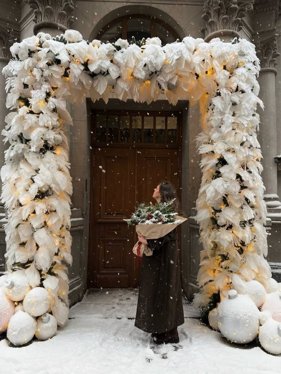 Особняк-контора Колобовых — редкий пример эклектики начала XX века. Особенно притягивает внимание парадный вход: массивная дверь, а зимой эффектное оформление с аркой из белых перьев и шарами. 📍 Большая Зеленина ул., 43А А вы уже видели это зимнее украшение? #локация Подпишись на Питер Бесплатно