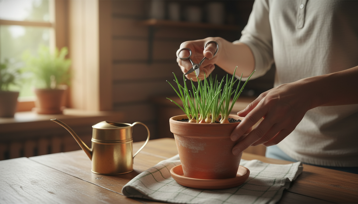 Теперь соберу всё в порядок действий без внешнего блеска. Берите упругий лук, прогрейте его в тёплой воде, но не обдавайте кипятком. Готовьте ёмкость с дренажом и рыхлой смесью, чтобы корни легко дышали. Давите лук донцем в почву на треть, оставляя плечики снаружи. Первые дни не заливайте, дайте корню схватиться. На свет переносите, когда корешки уже белеют, и обеспечьте 10-12 часов света. Поливайте, когда верх подсох, но не по расписанию, а по состоянию. Срезайте аккуратно и не бойтесь отпускать вторую волну, она приходит быстро. Если что-то идёт не так, ищите причину в трёх вещах — вода, свет и тепло. Всё остальное в этой культуре прощается.