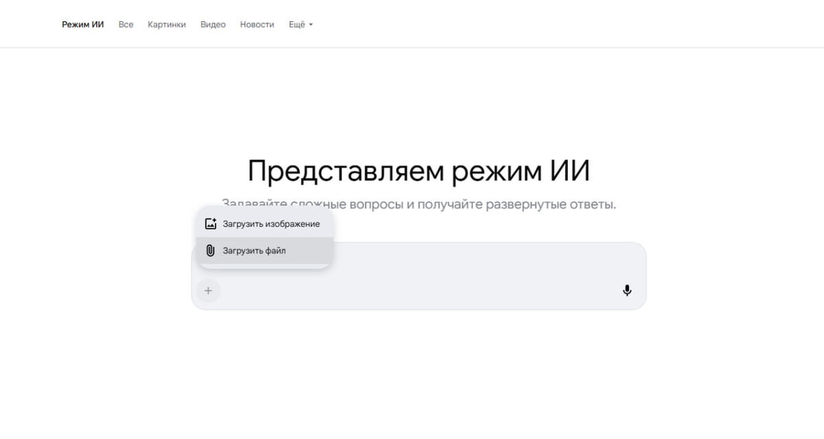 Кнопка "+" появляется на десктопной версии google.com, сначала для пользователей в США, а затем распространяется на другие страны, где доступен режим ИИ. Нажатие на нее открывает меню с опциями "Загрузить изображение" или "Загрузить файл". Поддерживаются популярные форматы, включая PDF, JPEG, PNG и другие документы.