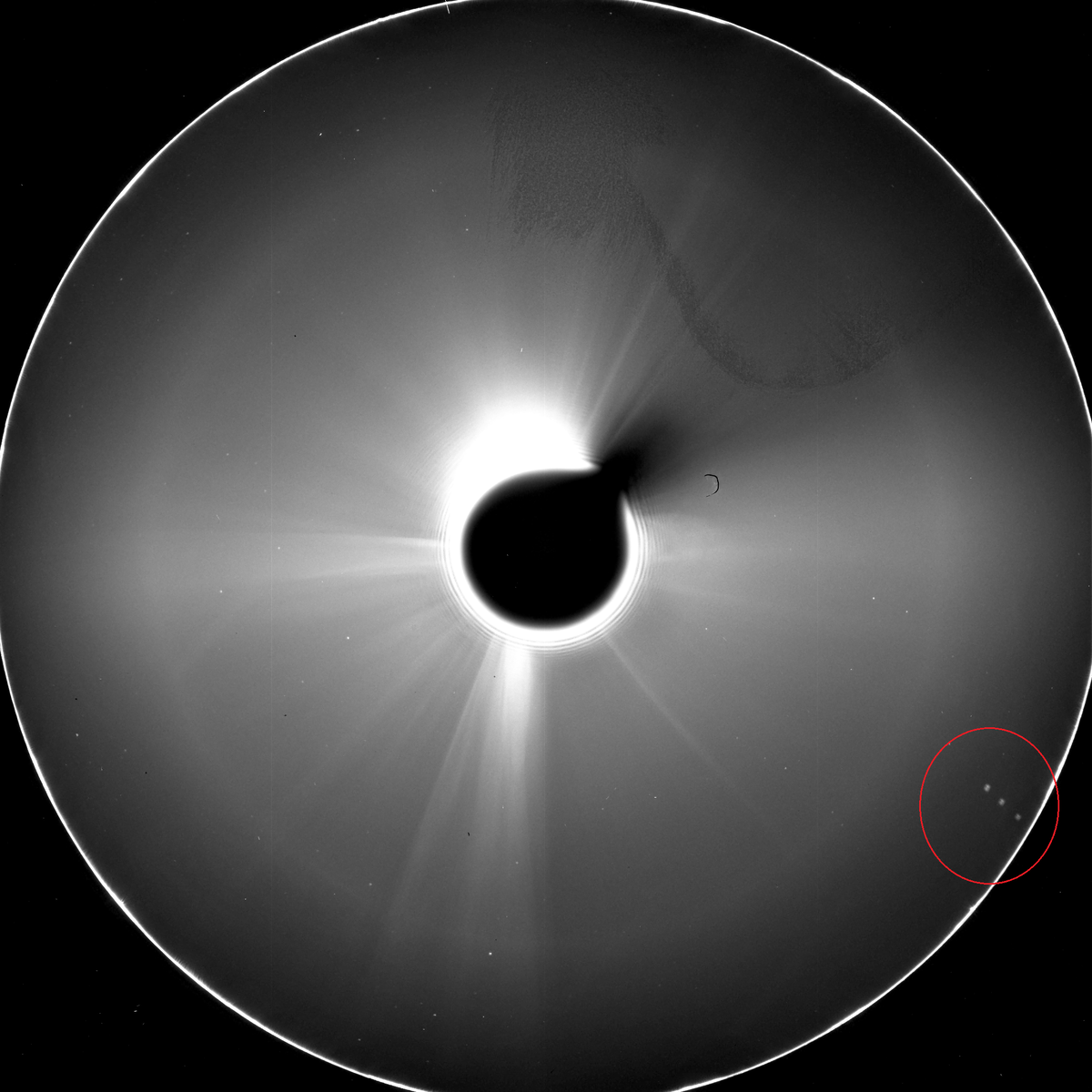 На оригинальном снимке без обработки, видно полное поле зрения коронографа COR2. Чёрный круг в центре - это окклюдер, скрывающий Солнце, окружённый светлым кольцом короны с лучами, расходящимися радиально. В нижней правой части видны три точки, выстроенные в аномально ровный ряд. Основная тема обсуждения: являются ли эти точки на снимке коронографа SECCHI STEREO A COR2 от 13 декабря 2025 года (время 22:07:45) обычным бликом линзы (lens flare), вызванным ярким светом Солнца или отражениями в оптике инструмента, или же это нечто иное?