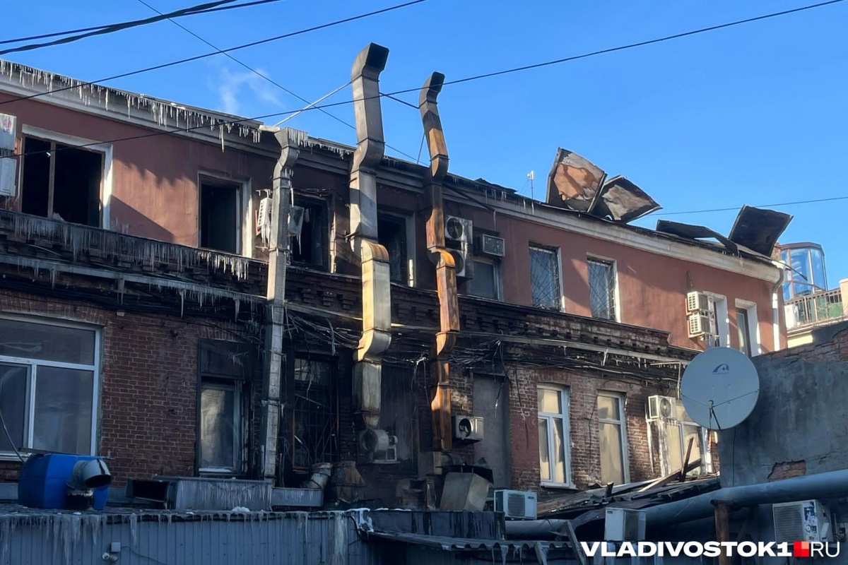 Вокруг все превратилось в лед, ходить местами скользко, до сих пор пахнет гарью, стены, асфальт покрыты сажей, а в одном месте от крыши