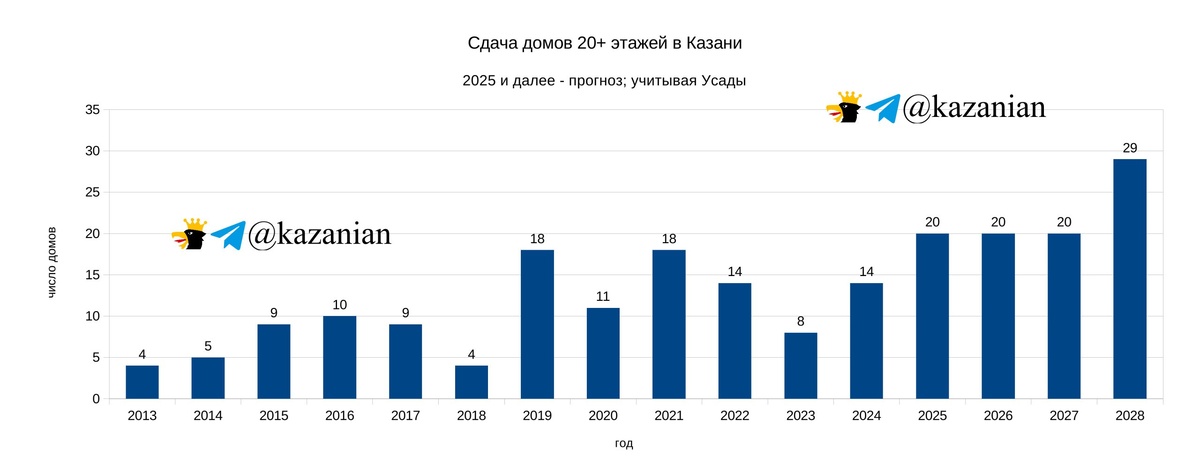 В этом году в Казани уже сдали 10 домов высотой 20 этажей и выше: ЖК "Крыловка парк" (2 дома) ЖК "Сказочный лес", дом "Кедр" ЖК "Яратам" (3 дома) ЖК "Светлая долина" (2 дома) ЖК "Счастье в Казани" (ex-Taloni) ЖК "Элегия" Кроме того, 4 дома сдали в усадском ЖК "Южный парк", которые мы тоже засчитываем Казани (а вот так хотим). Ожидаем сдачи в последние дни года: ЖК Savin Premier ЖК "Дубрава" (ex-Darvin) ЖК "Отражение" (3 дома) ЖК "Ривер Скай" (ex-Поколение) Впрочем, тут что-то ещё может сдвинуться на 2026. Планы и прогнозы По имеющимся планам застройщиков, в 2026 и 2027 годах должны сдать домов 20+ как в этом году. Фактические результаты, разумеется, будут отличаться - кто-то строит быстрее плана, а кто-то часто срывает сроки. А в 2028 году ожидается резкий скачёк, обусловленный набором темпов федеральными застройщиками (ПИК, Самолет), приходом в сегмент высотных домов КСИ. На фоне сохраняющихся темпов местных игроков это и даёт такой ожидаемый результат. Изначально план на 2028