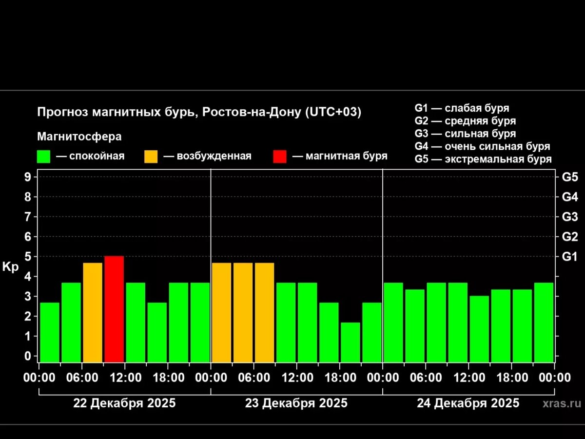Ученые предупреждают жителей Ростовской области о неспокойной геомагнитной обстановке в ближайшие дни. По данным Лаборатории солнечной астрономии ИКИ РАН, в ближайшие 24 часа в Ростове-на-Дону возможна магнитная буря. При этом ее уровень не должен превышать G1. Никаких событий, которые могли бы усилить возмущения, не предвидится. Согласно прогнозу на трое суток: Прогноз также указывает на следующую вероятную геомагнитную активность уже 30 декабря, а затем — во второй декаде января 2026 года. Жителям Ростовской области, особенно страдающим от сердечно-сосудистых заболеваний, гипертонии и хронической усталости, врачи советуют следить за давлением и соблюдать щадящий режим в дни повышенной солнечной активности.