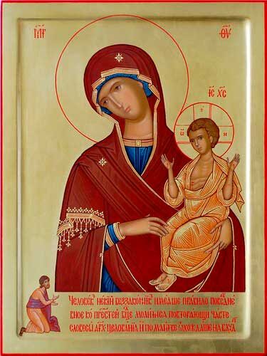 На иконе Божией Матери «Нечаянная Радость» изображен человек, молящийся на коленях перед иконой Пресвятой Богородицы. Иконографическим сюжетом для образа послужило предание об исцелении некоего юноши от плотской страсти через святой образ Владычицы Небесной, описанное в сочинении святителя Димитрия Ростовского «Руно Орошенное». Некий юноша, одержимый многими грехами и ведя порочную жизнь, имел обыкновение молиться перед образом Пречистой, произнося архангельское приветствие: «Радуйся, Благодатная, Господь с Тобою». Однажды, собираясь вновь на грешное дело, он вдруг увидел, что изображение Божией Матери на иконе ожило, а у Божественного Младенца открылись и кровоточат язвы на руках и ногах, из ребра Его также текла кровь. На вопрос пораженного ужасом молодого человека: «О, Госпожа, кто это сделал?» Богородица ответила: «Ты и прочие беззаконники грехами своими вновь распинаете Сына Моего». Только тогда раскрылась перед потрясенным до глубины души юношей бездна его грехопадения, долго мол
