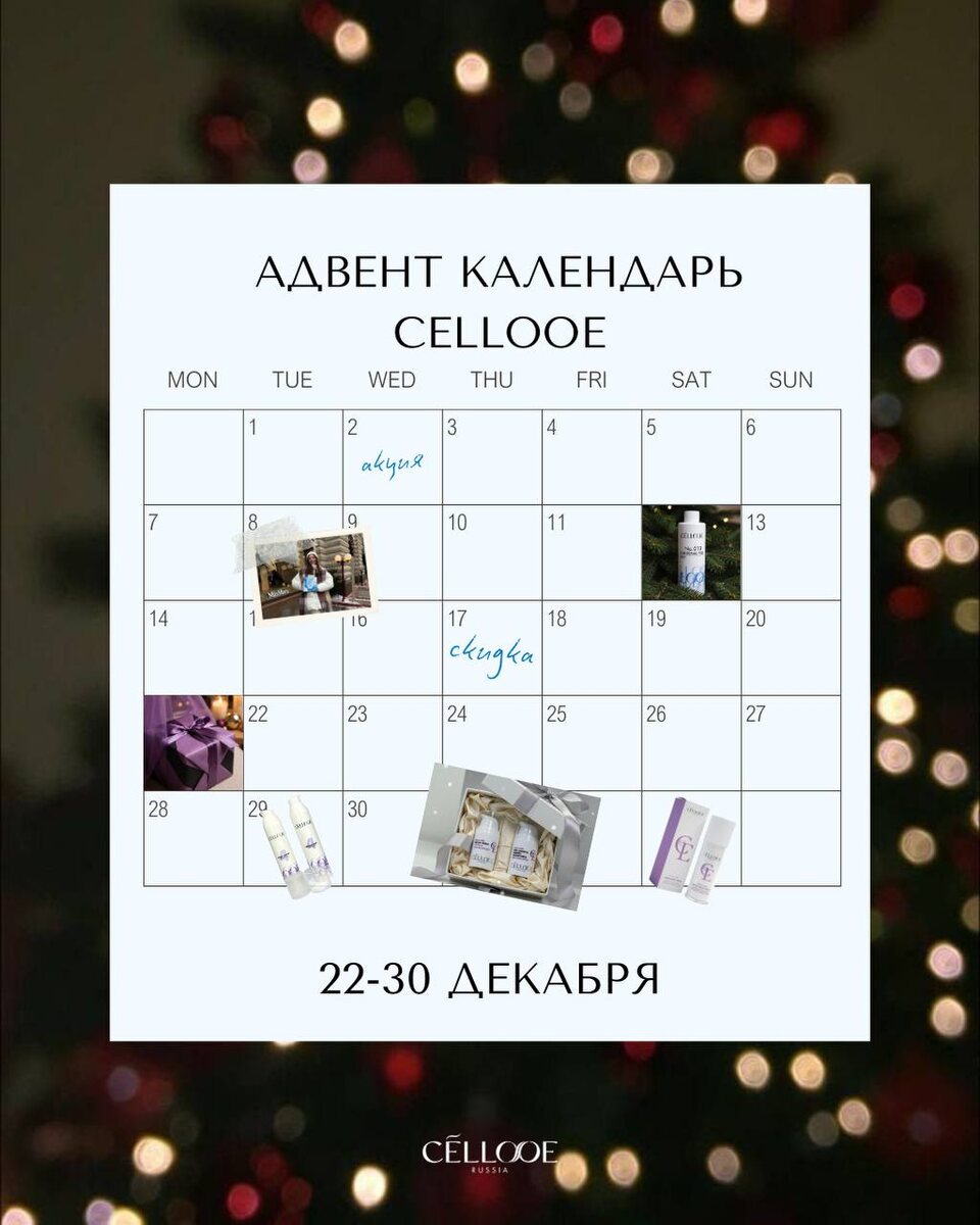 Сегодня стартует адвент-календарь CELLOOE!💙 Каждый день с 22 по 30 декабря до 18:00 (МСК) в сторис — новая акция или подарок. Важно: адвент-календарь будет отдельный для домашней линейки и отдельный — для профессиональной. 🤩Вопросы, заказ и наличие: WhatsApp: https://wa.me/79299055297 Telegram: @cellooemoscow