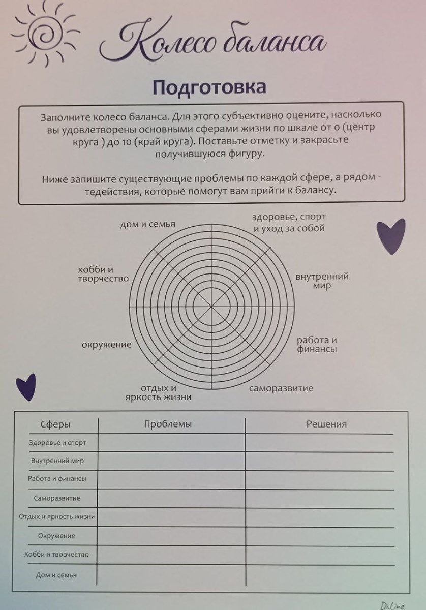 Возьмите цветные карандаши и заполните этот бланк Колеса баланса. Для этого уединитесь и успокойтесь, чтобы мысли были ясными, необходимо быть максимально осознанным. Оцените удовлетворённость каждой сферой в своей жизни в данный период времени и закрасте то количество делений, которое соответствует вашему ощущению. Где 1 - не удовлетворен, а 10 полностью удовлетворен. Теперь посмотрите что у вас вышло. Если получившая фигура близка к кругу, то это очень хорошо, в вашей жизни преобладает гармония. Если вы видите ямки, то это говорит о необходимости изменений в указанных сферах жизни. Теперь необходимо поставить себе по 3-4 цели в сферах, которые у вас больше всего отстают. В остальных, достаточно будет по 1 цели, чтобы сбалансировать ваше колесо. И в первую очередь работать там где больше всего перекос. Делитесь, что у вас получилось и мы двигаемся дальше💕