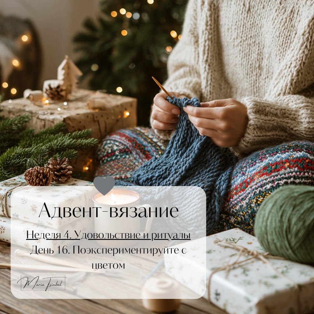 Удовольствие и ритуалы ________________________________________ День 16. Поэкспериментируйте с цветом Сегодня выберите цвет пряжи, из которой не вязали очень давно, но очень хотели. Вяжите, не думая о сроках или завершении проекта — просто наслаждайтесь ритмом и процессом. Свяжите небольшой узор и оставьте его в своей копилке. Новизна, непривычная взгляду и даже короткий промежуток времени возвращает чувство радости. Позвольте себе просто быть здесь и сейчас, с каким-то новым вязанием. Какой цвет пряжи выбрали? * Весь декабрь по будням в 8:00 у нас выходят задания для вдохновения и уюта. Участвуйте в нашем маленьком челлендже. Присоединяйтесь в любой момент. Вся программа Адвента здесь: https://dzen.ru/media/feelknit/privet-dorogie-692d209978188f2a4af3e736
