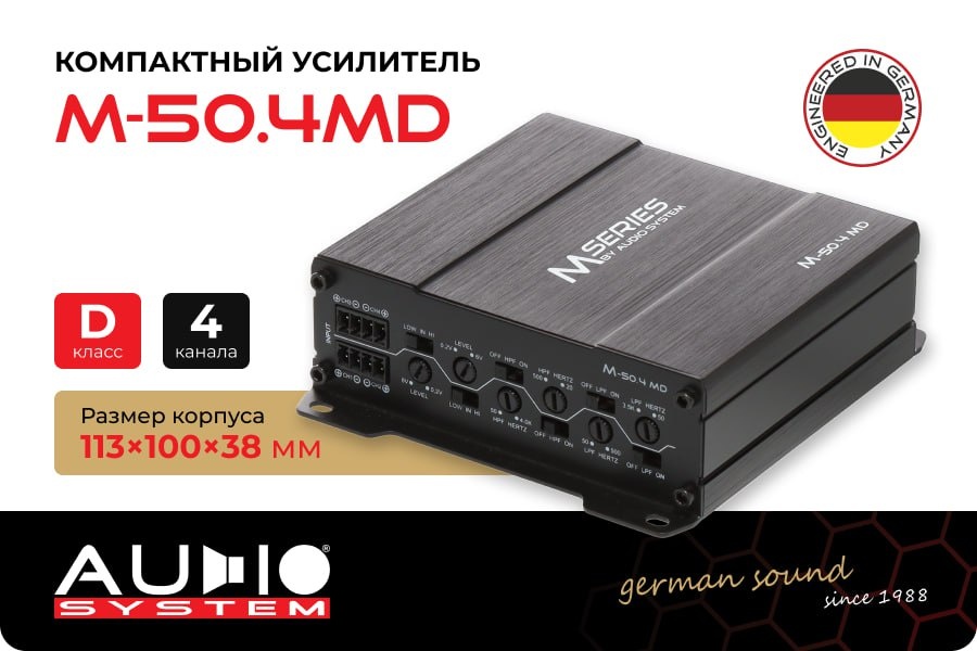 Из последнего поступления в Россию усилителей известного немецкого бренда привлекает внимание необычная модель - Audio System M-50.4 MD. Это усилитель ультракомпактного форм-фактора: по большей стороне он даже короче, например, любого айфона. Идеален для нестандартных решений. За счет высокого КПД и довольно низкой теплонагруженности, открываются расширенные возможности инсталляции: под сидением, за бардачком, в панели за головным устройством и т. д. Удобен для поканального усиления акустики, производителем предлагаются полосовые фильтры. А при использовании в процессорной системе, есть возможность отключения кроссоверных фильтров. То есть устройство универсальное для установщика. Рекомендованная розничная цена на текущее время всего 17 850 ₽. Обратите внимание на эту любопытную модель, имейте ввиду и используйте в ваших установках. Описание на российском сайте производителя: https://audiosystem-de.ru/catalog/amplifiers_dsp/4-channel/319/#props
