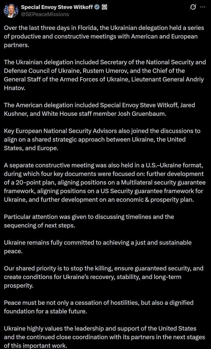 За последние три дня во Флориде украинская делегация провела ряд продуктивных и конструктивных встреч с американскими и европейскими партнерами. В состав украинской делегации вошли секретарь Совета национальной безопасности и обороны Украины Рустем Умеров и начальник Генерального штаба Вооруженных сил Украины генерал-лейтенант Андрей Гнатов. Американскую делегацию представляли специальный посланник Стив Виткофф, Джаред Кушнер и сотрудник Белого дома Джош Грюнбаум. Ключевые советники по национальной безопасности из стран Европы также присоединились к обсуждениям для согласования общего стратегического подхода между Украиной, Соединенными Штатами и Европой. Также состоялась отдельная конструктивная встреча в формате США–Украина, в ходе которой основное внимание было уделено четырем ключевым документам: дальнейшей разработке плана из 20 пунктов, согласованию позиций по многосторонней системе гарантий безопасности, согласованию позиций по системе гарантий безопасности для Украины со ст