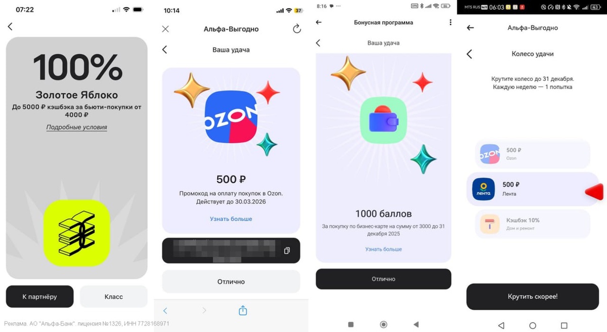 Начало недели - пора собирать плюшки от Альфы⬇️: 🟥 По обычным картам Альфа-Банка не забываем крутить барабан на Золотом Яблоке — до 100% кэшбэка. Ищем по слову «Золотое яблоко». У меня 25% на покупки от 3000. FAQ | Правила Сегодня в течении дня должны появиться и другие барабаны - ждем, напишу. 🟥 По карте Альфа-Бизнеса сегодня вновь можно крутить колесо удачи. Заходим в Сервисы → Альфа Выгодно → "Колесо удачи". У меня выпал Ozon на 500 рублей. 🟥 Новенькие клиенты Альфа-бизнеса, которые открыли счет с картой в декабре - проверьте у себя, некоторым поменяли выбранные категории кэшбэка (5-10%) на 10% на ВСЁ. Исключения (pdf): 4829, 5999, 6010–6012, 6050, 6051, 6211, 6529–6534, 6536–6538, 6540, 7273, 7276, 7299, 7311, 7399, 7995, 8999, 9222, 9311, 9406. Налоговый 9390 не бонусируется, так как кэшбэк начисляются только на МСС которые есть в банке. Напомню, за оформление бизнес‑карты сейчас дают: ⭐️ 2000 руб. по ссылке вместе с регистрацией ИП ⭐️ 2000 руб. по ссылке с открытием с