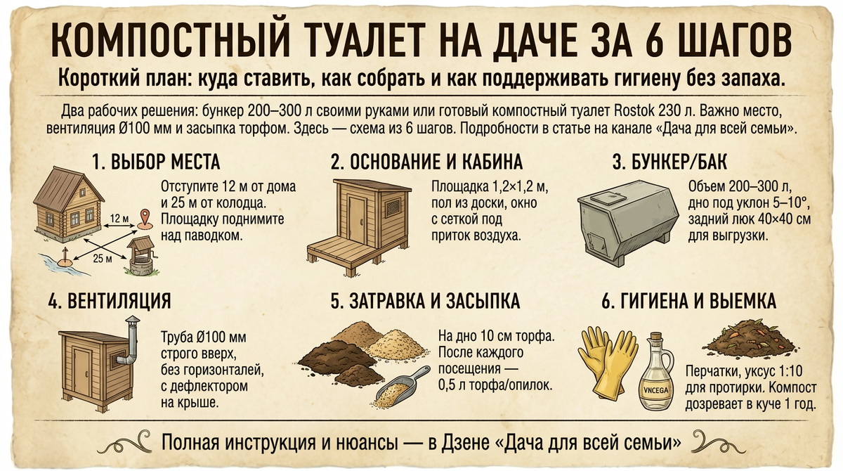 Для дачи я считаю удачными два решения — самодельный компостный туалет непрерывного действия с торфяной засыпкой и вентиляцией и готовая система типа компостный туалет Rostok 230 литров или аналогичный торфяной биотуалет. Оба варианта работают без запаха при правильной вентиляции, требуют 10 см «затравки» из торфа на дно и соблюдения расстояний — не ближе 12 м до дома и, по консервативному подходу, 25 м до колодца. Гигиена — простая: после каждого посещения пол-литра торфа или опилок, раз в сезон опорожнение, перчатки и уксусный раствор 1:10 для уборки. Поверьте, это работает.