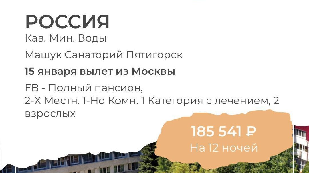 А может махнуть в январе в санаторий? Тепло, спокойно и очень полезно для здоровья. У нас есть три проверенных санатория, которые нравятся нашим туристам. Один из них находится в Ессентуках. Это достаточно свежий санаторий с хорошими, комфортными номерами. Гостей ждут халаты, тапочки и минимальный набор гигиенических принадлежностей, чтобы с первых минут чувствовать себя уютно и расслабленною Большой плюс — удачное расположение: совсем рядом источник, курортный парк и основные достопримечательности города, поэтому можно легко сочетать лечение с прогулками. Питание здесь выше среднего и организовано по системе «шведский стол» — разнообразно, вкусно и сбалансированно. Медицинская база позволяет пройти лечение по самым разным направлениям, а врачи и медсестры всегда доброжелательны, внимательны и профессиональны. Рекомендуем начинать год с заботы о здоровье и качественного отдыха. Смотрите нашу подборку и выбирайте!