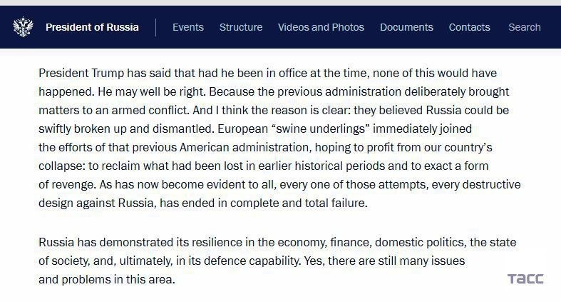 ▶️ Официальный перевод фразы Путина про «европейских подсвинков» появился на сайте Кремля. Её перевели как swine underlings.