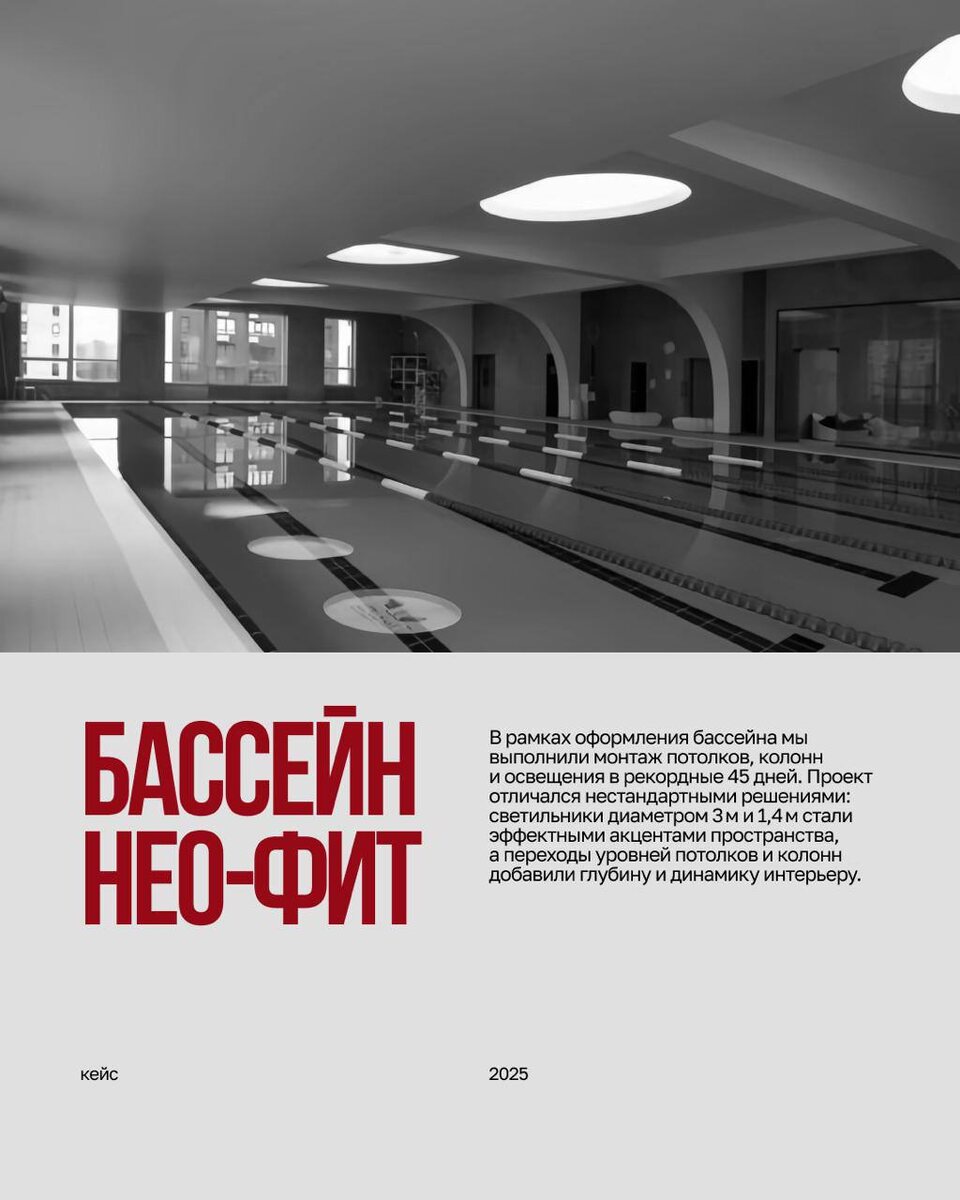 🏊♀ За 45 дней мы реализовали монтаж потолков, колонн и освещения — включая нестандартные светильники диаметром 3 м и 1,4 м, переходы уровней и самонесущий ЛСТК-каркас. Как это выглядит в итоге — смотрите в карусели ⬆️