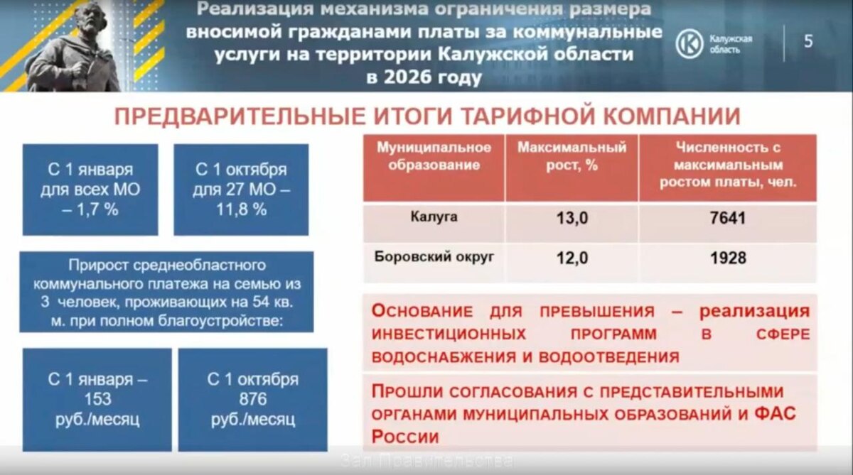В следующем году планируется рост цен на услуги жилищно-коммунального хозяйства. Это позволит финансировать программы по замене отслуживших сетей, которых сейчас достаточно много, пояснили на заседании правительства региона. ⬇️ Рост цен в Калужской области планируется в 2 этапа: 🔵 1 января — на 1,7%, 🔵 1 октября — от 9,7% до 11,8%. Это один из самых низких показателей в ЦФО. Например, в Орловской, Тверской и Белгородской областях рост может составить до 29%. ❗️ Какие тарифы вырастут в регионе? 🔴 Газ — на 9,9%, 🔴 Отопление — на 8,3%, 🔴 Электричество — на 11,2%, 🔴 Водоотведение — на 9,3%, 🔴 Водоснабжение — на 10,5%, 🔴 ТКО — на 9,7%. Существует соцподдержка, чтобы платить за ЖКХ меньше: 📌 Субсидии, если расходы по ЖКХ превышают 19% доходов семьи, 📌 Для сельской местности и граждан с электроплитами оплата за энергию с понижающим коэффициентом, 📌 Федеральные льготы на технологическое присоединение к электрическим сетям для льготных категорий, 📌 Для всех граждан бессрочная до