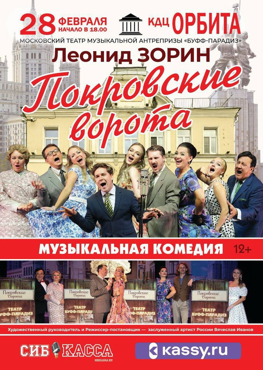 ! Московский театр музыкальной антрепризы «БУФФ-ПАРАДИЗ» представляет музыкальную комедию «ПОКРОВСКИЕ ВОРОТА» по легендарной пьесе Леонида Зорина и сюжету одноименного и всеми любимого фильма Михаила Казакова. «Покровские ворота» — это больше, чем пьеса, фильм или всем известная история. Это настроение. Эпоха. Внутренний дворик. Стук пишущей машинки. Диалоги, которые все мы помним наизусть, даже если не пересматривали лет десять. Это трогательная, смешная и очень живая история про любовь, взросление и дружбу. В этом ярком спектакле будет много великолепной музыки, зажигательных танцев, юмора, задора, оптимизма и горячей веры в то, что все получится и, что человеку в жизни все по плечу! В спектакле принимают участие ведущие солисты столичных музыкальных театров. 📆Дата: 28 февраля 2026 суббота 18:00 📍Место: Иркутск КДЦ Орбита Советская, 139 Купить билет 📆Дата: 1 марта 2026 воскресенье 18:00 📍Место: Ангарск ДК Нефтехимик 63 квартал, 1 Купить билет