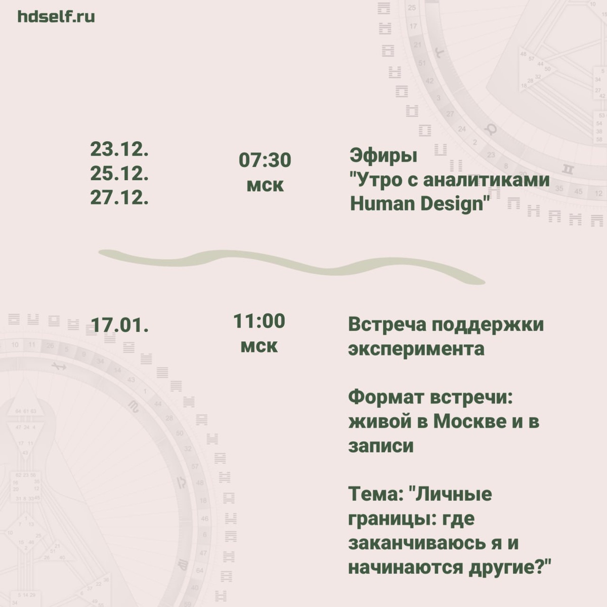 ▫️23.12., 25.12. и 27.12 в 07:30 МСК в сети Clubhouse "Утро с аналитиками Дизайн Человека" Тема недели "Спокойствие и отстранённость" ▫️17.01. в 11:00 МСК Встреча поддержки эксперимента в формате живой встречи в Москве и в записи Тема: "Личные границы: где заканчиваюсь я и начинаются другие?" Записаться по ссылке Сохраните себе расписание, перешлите друзьям. И присоединяйтесь) #hdselfru_информационное
