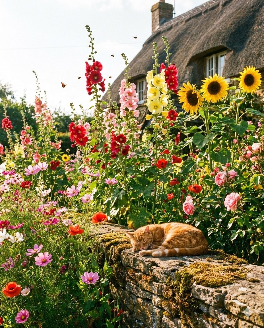 ! ✨ Старый домик с соломенной крышей 🏡 утопает в буйстве летних цветов. Высокие мальвы и яркие подсолнухи создают живую стену, где порхают бабочки, а воздух напоен ароматом мёда. 🌿 Кажется, даже природа шепчет: "Тихо, здесь отдыхают". Главный хранитель этого невероятного уюта — рыжий кот, который нашёл идеальное место для сна на мшистой каменной стене. Это место, где точно живут добрые лесные 🧚♀️ и растут волшебные 🍄. Настоящая дачная идиллия! #сказочныйсад #дачныйдекор #уют #ландшафтныйдизайн
