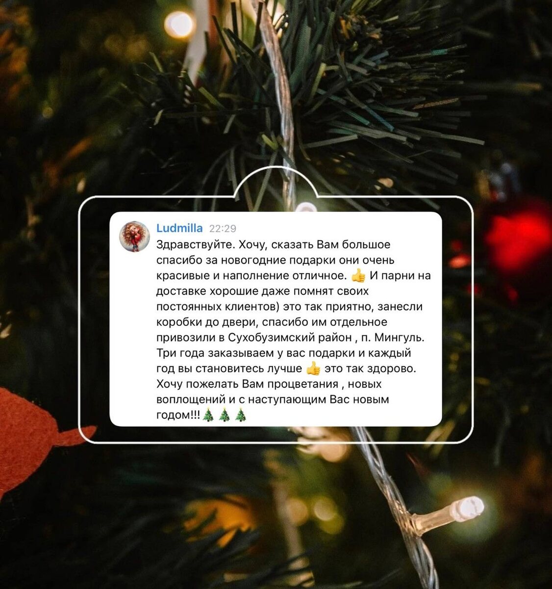 ! Огромное спасибо нашим клиентам за такие искренние и тёплые отзывы! Нам очень приятно, что вы отмечаете качество подарков, наполнение и работу доставки. Мы стараемся для каждого клиента! Спасибо, что выбираете нас снова и снова☺️ Ваша поддержка мотивирует расти, развиваться и создавать ещё больше красивых новогодних подарков 🎁 С наступающим Новым годом! 🎄 Пусть он принесёт радость, тепло и много приятных моментов ✨