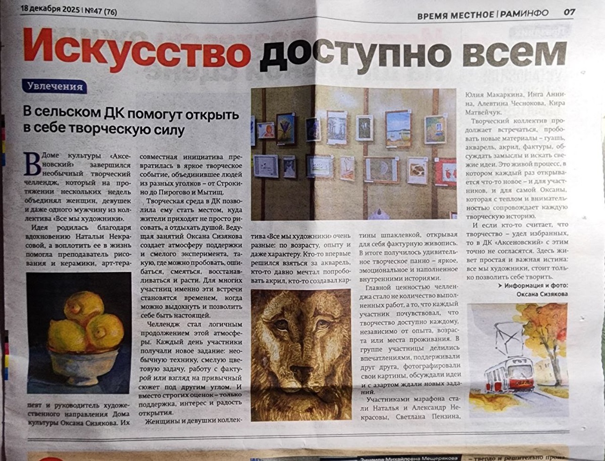 📰✨ Друзья, случилось невероятно волнительное и радостное событие! Нашу статью опубликовали! Она — про удивительных людей и про то, как творчество меняет жизнь. Помните, мы с вами обсуждали, что настоящие истории часто живут рядом с нами? Вот одна из них. Мы написали о творческом челлендже в Доме культуры «Аксеновский» (с. Строкино), который объединил женщин, девушек и даже одного мужчину из коллектива «Все мы художники». Суть челленджа была проста и глубока: каждый день — новое задание. Особая ценность этой истории в том, что она напоминает: Талант не зависит от места,где живёшь — будь то село Строкино, Пирогово или Мытищи. В каждом человеке есть творческая искра. Стоит дать ей пространство — и она вспыхнет. Цитирую слова, которые стали главным выводом статьи: «Важно не то, насколько идеально всё получилось. Важно, что в этот момент человек был честен с собой, позволил себе творить и почувствовал радость». Челлендж завершился, но его результат — десятки ярких работ и ещё более