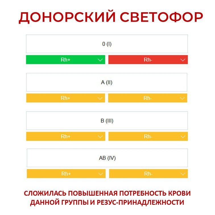 ! Напоминаем, что «Донорский светофор» — это наш онлайн-индикатор, который показывает, какие группы крови нужны нам прямо сейчас в большей степени. 🚦 Как читать наш светофор: 🔴 Красный: Острая потребность. Крови этой группы очень мало. 🟡 Желтый: Стабильная потребность. Крови этой группы недостаточно. 🟢 Зеленый: Запас достаточен. Но вы всё равно прийти и сдать кровь. Ситуация может измениться. ❗️Важный момент: Мы принимаем доноров с ЛЮБОЙ группой крови!