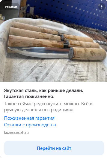 Вышло в ленте вот такое рекламное объявление. Персонаж, сразу скажем, вообще не в теме. Лживый. Из чего это следует: 1. Персонаж заявляет, что его нож из "якутской стали как раньше делали".