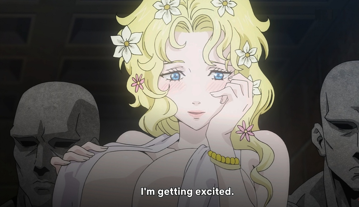 Юмор, граничащий с безумием. О чём это я? В таких аниме принято ждать некоторой серьёзности, пафоса, или даже эпичности. Но иногда проскакивает вот такой юмор, который как по мне может и неплох, но раздражает. Понятно что нужно было разбавлять серьёзность, но видеть Зевса помешанным на той кто годится ему разве что во внучки, это кринж. Но всё же на такие моменты реагируешь нормально и дальше юмор уже куда интеллектуальнее.