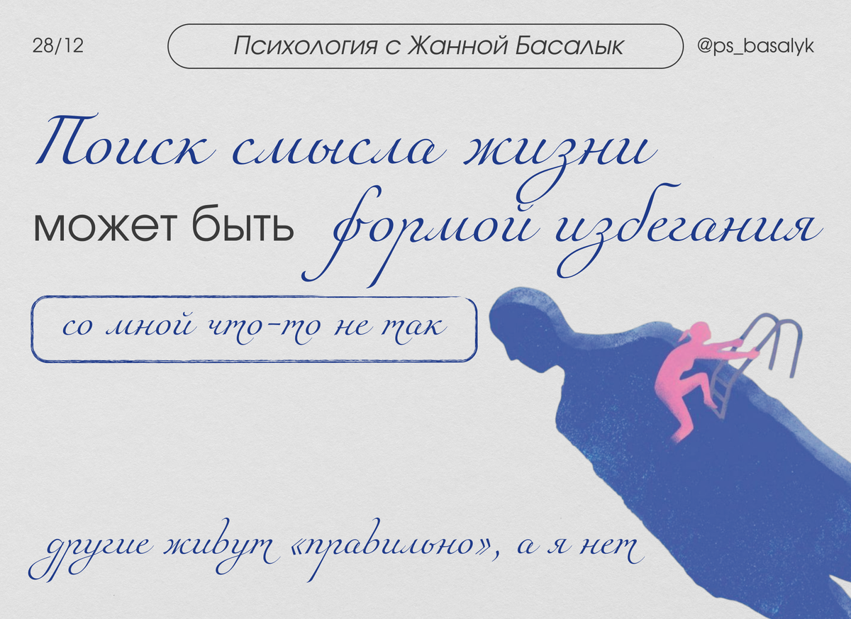 В практике психолога я регулярно вижу один и тот же сценарий, человек рефлексирует, много читает про психологию, кризисы, предназначение. Может часами рассуждать о смысле жизни — но: И тогда возникает неудобный, но честный вопрос: а поиск смысла — это точно поиск? Или способ не делать выбор? Экзистенциальная терапия и исследования мотивации показывают важную вещь: абстрактный поиск смысла часто активируется там, где страшно сделать конкретный шаг. Пока человек размышляет: — он ничего не теряет и ни за что не отвечает. Поиск смысла становится безопасным убежищем. С точки зрения психики — это гениальный механизм защиты. В итоге мозг выбирает не жизнь, а разговор о жизни. Смысл почти никогда не предшествует действию. Он появляется после. Исследования показывают: люди начинают ощущать осмысленность жизни ретроспективно — когда уже сделали сложный, рискованный, иногда ошибочный выбор. Никто не «нашёл смысл», а потом ушёл из токсичных отношений.