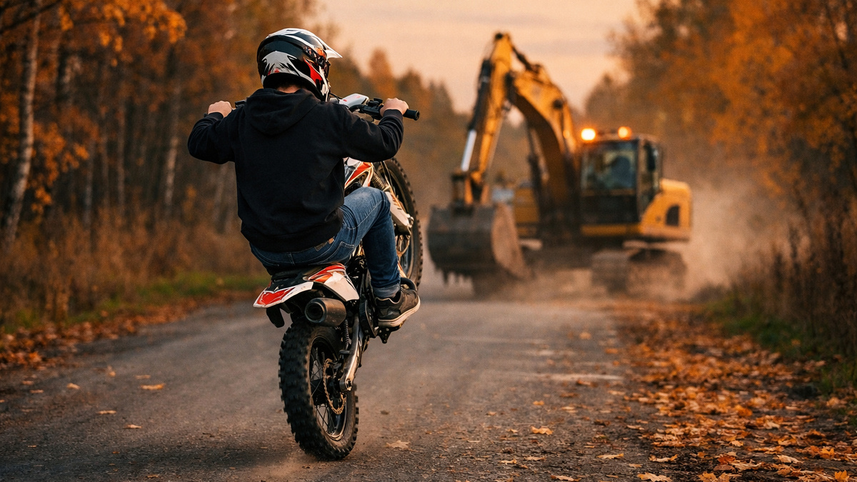 Подросток ехал на заднем колесе и врезался в экскаватор