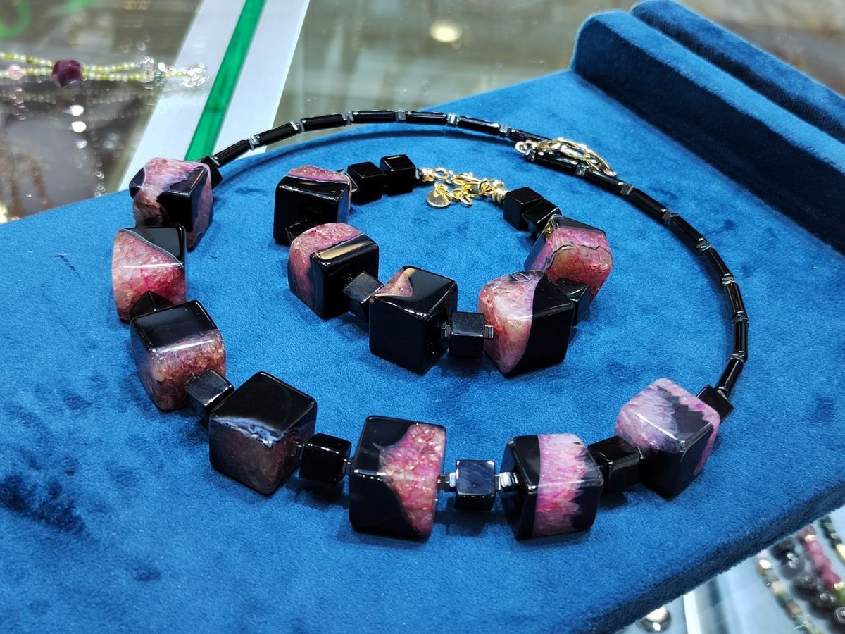 Крупные кубы Агата с друзой, ожерелье собрано на сталь, длина по окружности 47 см, + удлинительная цепочка 3 см