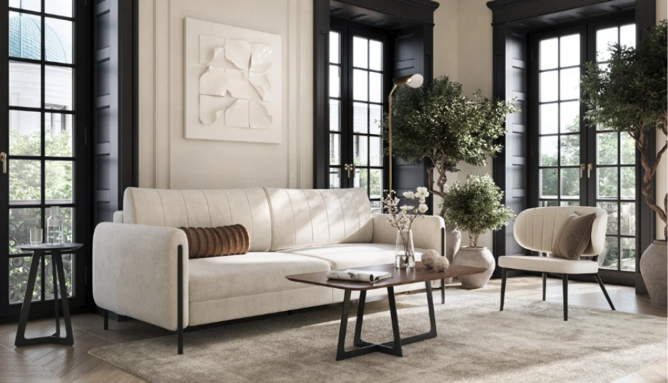 Текстиль играет важную роль в оформлении интерьера. Он создает атмосферу и корректирует восприятие пространства, а также объединяет различные элементы мебели. Сегодня мы расскажем, как его правильно сочетать, а также дадим несколько полезных советов по выбору цветовой гаммы и актуальных фактур. Диван «Зета» Как сочетать фактуры, узоры и цвета текстиля? Чтобы текстиль смотрелся стильно и гармонично, важно знать ряд базовых правил по его выбору и сочетанию разных элементов между собой. Формула 60-30-10. Эта пропорция помогает достичь гармонии в интерьере. 60 % отводится базовому цвету, например для штор или покрывал, 30 % – для дополнительного оттенка (декоративные подушки), а 10 % – для ярких акцентов (небольшие аксессуары). Монохромная палитра. Оттенки одного цвета, такие как светло-бежевый в дополнение к коричневому или нежно-голубой в сочетании с темно-синим, придают интерьеру элегантность и спокойствие. Контрастные сочетания. Классические пары, такие как синий и оранжевый или зелен