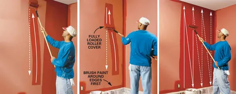Начинайте с прокрашивания углов, стыков и труднодоступных мест кистью. Затем переходите к основной площади стены, используя валик. Окуните валик в краску, отжмите на рифлёной части кюветы, чтобы удалить излишки. Наносите краску W‑образными или крестообразными движениями, перекрывая каждый следующий проход на 3–5 см. Двигайтесь сверху вниз, избегая сильного давления на валик, это предотвратит появление подтёков.