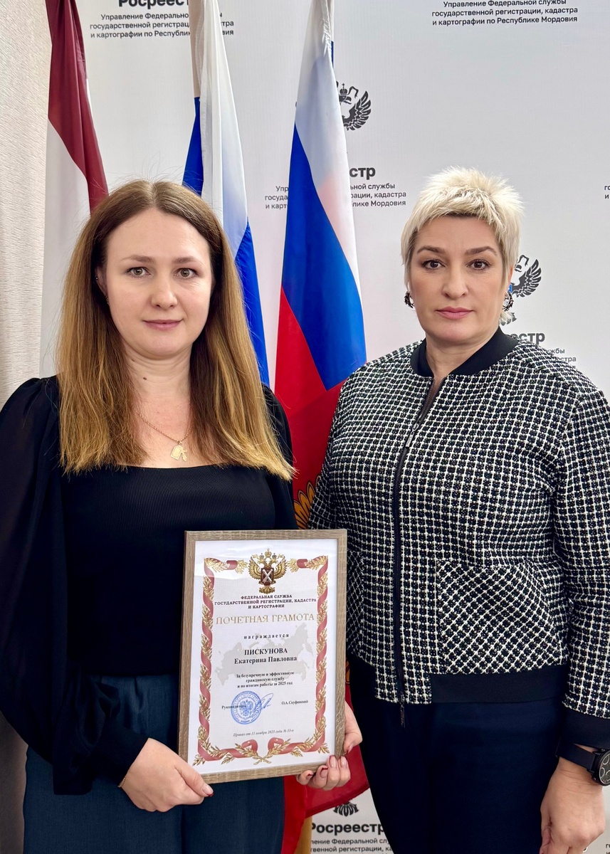 📋 Еженедельное оперативное совещание в Управлении Росреестра по РМ началось с церемонии награждения 🎉 За безупречную и эффективную гражданскую службу и по итогам работы за 2025 год Почётной грамотой Федеральной службы государственной регистрации, кадастра и картографии награждены Екатерина Пискунова, ведущий специалист-эксперт отдела государственной регистрации недвижимости и Галина Тиньгаева, ведущий специалист-эксперт межмуниципального Рузаевского отдела 🤝 Вручая награды сотрудницам, руководитель Управления Светлана Балескова высоко оценила их профессионализм и поблагодарила за добросовестный труд #Росреестр #РосреестрМордовия #Награждение #Мордовия