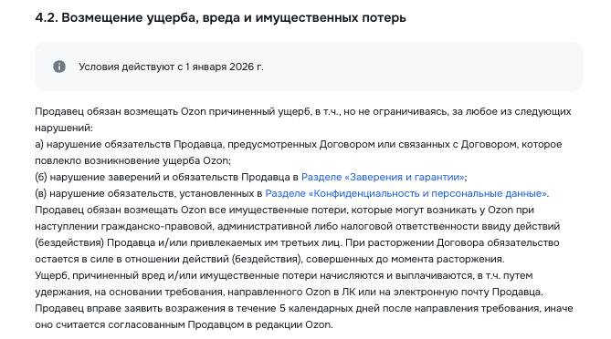 Причём очень жёстко. С 1 января 2026 года в договоре появляется формулировка, на которую стоит обратить внимание всем селлерам. Теперь продавец обязан возмещать Ozon все имущественные потери, возникшие из-за его действий или бездействия. И речь идёт не только про гражданско-правовую или административную ответственность, но в том числе про налоговую. Что это означает на практике: ✔ если из-за продавца у Ozon возникнут налоговые претензии, доначисления, штрафы или пени — Ozon формально получает право переложить эти потери на продавца; ✔ ответственность распространяется и на действия, и на бездействие; ✔ учитываются не только нарушения договора, но и разделы про гарантии, персональные данные, конфиденциальность; ✔ удержание может происходить напрямую — через ЛК или списанием; ✔ если продавец не возразил в течение 5 дней, считается, что он автоматически согласился с расчётом Ozon. Фактически продавца делают крайним по любым рискам, которые маркетплейс может связать с его деятельностью