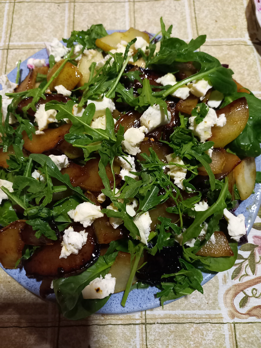 Всем привет ! Сегодня на моем канале будет рецепт салата, который в своем составе сочетает фрукты и овощи. Плюсом соленый сыр, зелень и пряную заправку и в совокупности это очень вкусно! Готовится он несложно, а результат превзойдет все ожидания! Этот салат – настоящее украшение Вашего стола. Первый раз этот салат готовила на даче. Поэтому фото в "деревенском" стиле! Способ приготовления: Запекаем свеклу: Свеклу тщательно моем, заворачиваем каждую в фольгу и отправляем в разогретую до 180°C духовку. Запекаем до мягкости, примерно 1-1.5 часа, в зависимости от размера. Готовность можно проверить, проткнув свеклу ножом – он должен легко входить. Освобождаем от ольги и остужаем. Фото процесса делать не стала, думаю, что тут ничего нет сложного. Карамелизируем груши: Груши моем, удаляем сердцевину и нарезаем дольками или кубиками. На сковороде растапливаем сливочное масло, выкладываем груши. Добавляем сахар. Обжариваем на среднем огне, периодически помешивая, до мягкости и легкой