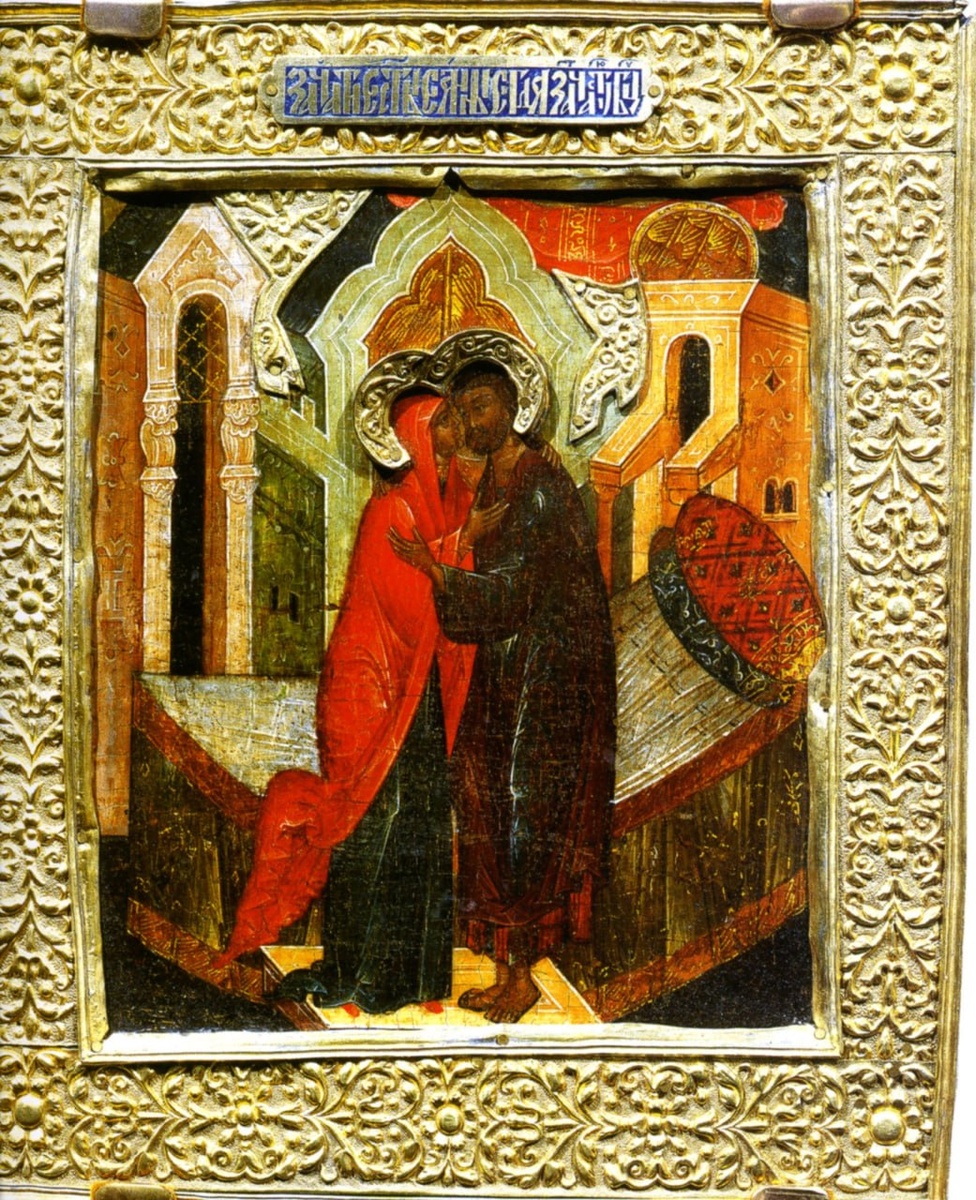Иконы XVI-XVIII вв. Согласно протоевангелию Иакова, у благочестивой семейной пары Иоакима и Анны долгое время не было детей. Когда первосвященник отказал Иоакиму в праве принести Богу жертву, так как он «не создал потомства Израилю», он удалился в пустыню, а его жена осталась дома в одиночестве. В это время им обоим было видение ангела, возвестившего, что Господь внял их молитвам и им нужно отправиться в Иерусалим. Они встретились у Золотых ворот, "и Анна, стоявшая у ворот, увидела Иоакима идущего, и, подбежав, обняла его, и сказала: Знаю теперь, что Господь благословил меня: будучи вдовою, я теперь не вдова, будучи бесплодною, я теперь зачну!"