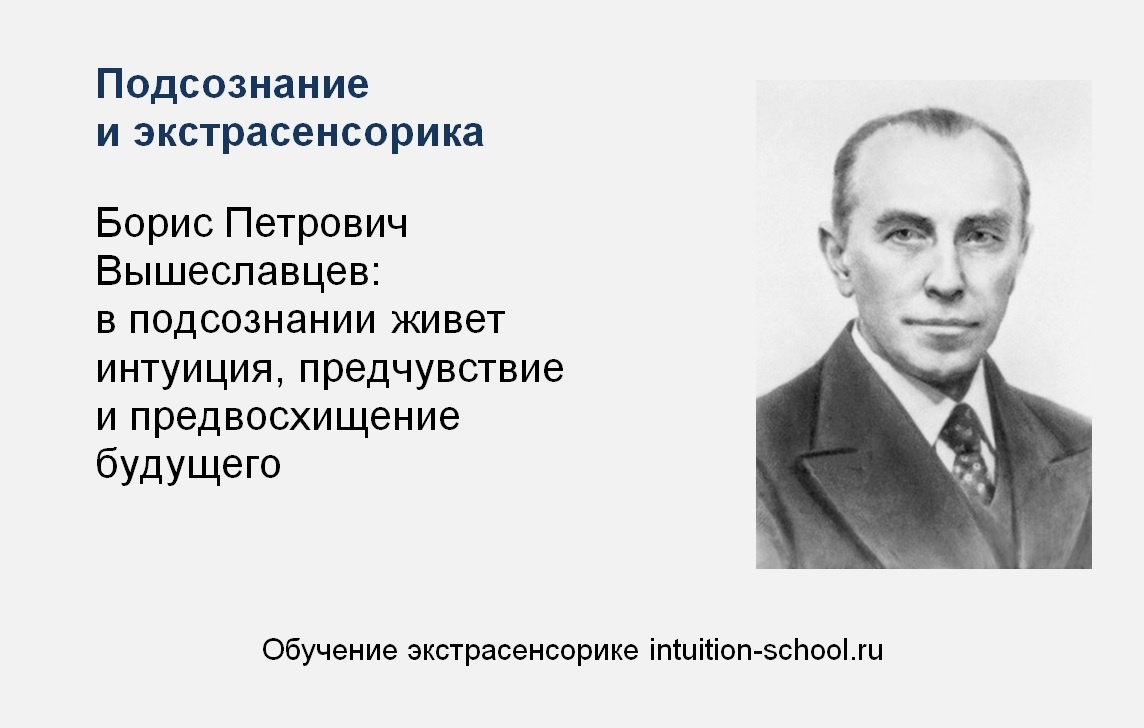 Профессор Борис Петрович Вышеславцев в своей книге «Вечное в русской философии» высказывает свое мнение о подсознании: «Но главное – в подсознании живет предчувствие и предвосхищение будущего, интуиция возможностей, заключенных в настоящем. Здесь лежит ключ к тайне предсказаний». «Главное, на что указывает научный оккультизм, парапсихика, – это таинственная и неисследованная мощь подсознания». «Мы погружены в это коллективно-бессознательное, – оно в нас и мы в нем. И мы можем прочесть в нем всю душевную историю человечества….» «Коллективно-бессознательное не умирает и не рождается, равно как оно и не засыпает, хотя оно растет и трансформируется; оно лежит глубже, нежели смена рождения и смерти, дня и ночи. И вместе с тем мы в нем и оно в нас; но что такое коллективно-бессознательное? Погружаясь в глубину собственного подсознания, мы находим там подпочвенное напластование всех слоев нашей жизни – это эмоционально-подсознательная память, которая хранит все и помнит все, но из которой соз