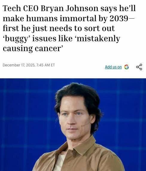 Хайповый миллиардер и биохакер считает, что ИИ, новые терапии и радикальные эксперименты с телом приведут человечество к «обновлению» в виде вечной жизни. Джонсон уже живет в этом будущем: он переливает себе кровь своего 17-летнего сына, сделал ИИ своим главным врачом и выращивает клоны собственных органов для тестирования лекарств. Однако он честно признает, что пока существуют риски, включая вероятность развития рака или других серьезных побочных эффектов. Ожидаем 2039 года. NeuroFlux #бессмертие #БрайанДжонсон #биохакинг #искусственныйинтеллект #радикальныеэксперименты #медицина #новости #будущее #технологии #здоровье