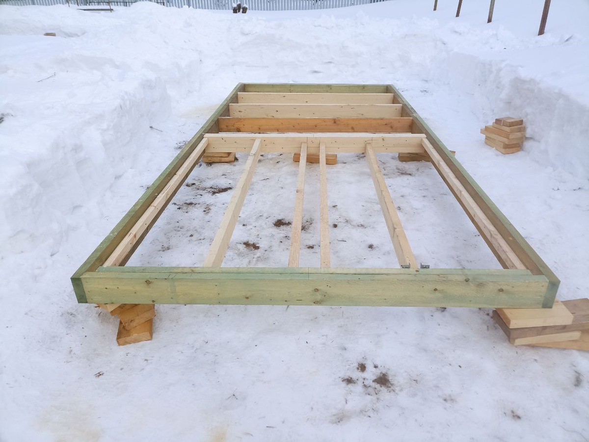 Основной каркас выполняется из доски минимум 150мм, так же можно объединить обвязку и сваи, по центру используем доски 100мм, расстояние между досками 128мм (туда встанет желоб слива)