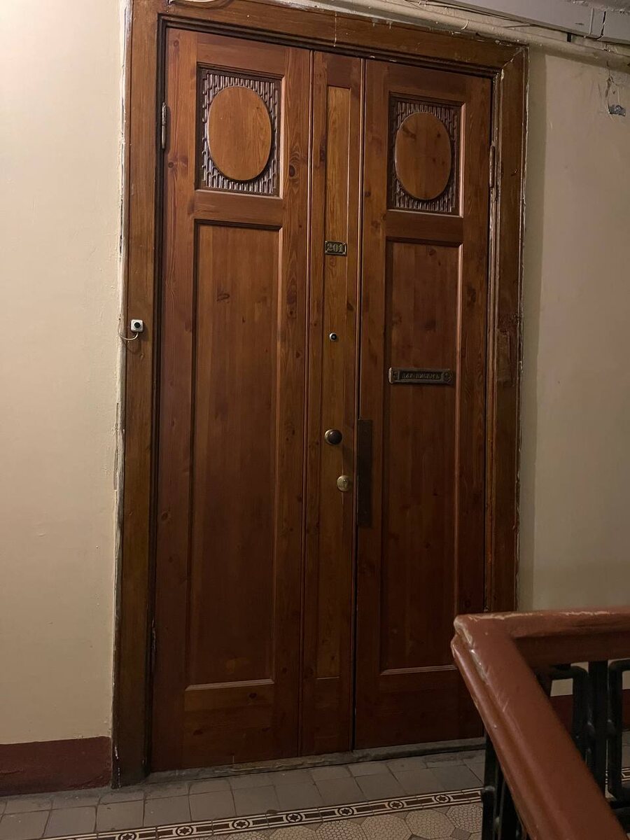 Вот такие, сохранившиеся, двери меня порадовали. Со щелями для почты и ещё какими-то непонятными встроенными механизмами… 😳